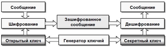Суть асимметричных криптосистем состоит в том, что ключ, используемый для шифрования, отличается от ключа дешифрования. Ключ шифрования не является секретным, но дешифрование с помощью известного ключа шифрования невозможно. Для дешифрования используется отдельный секретный ключ. Знание открытого ключа не позволяет определить ключ секретный для дешифрования информации. Т.е., дешифровать информацию может только получатель, владеющий секретным ключом (рис. 2).