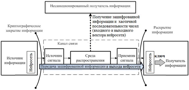Решением проблемы передачи зашифрованной информации и ключа для шифрования/дешифрования является использование нейронных сетей, по одной для каждого из пользователей. Пользователи должны синхронизировать свои нейронные сети, вследствие чего на основании весовых коэффициентов нейронных сетей будет вычислен ключ для шифрования/дешифрования. Общая схема предлагаемого подхода представлена на рисунке 4.