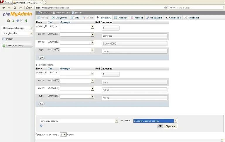 Теперь в нашей базе данных имеется пустая таблица Product, которую нужно заполнить, для этого в верхнем меню выберите вкладку «Вставить» и перед вами откроется страница для заполнения данных полей (см. рис.4).