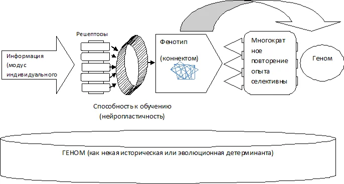 При этом кратковременные изменения не ведут к серьезным преобразованиям генотипа. Но долговременное воздействие ведет к серьезному преобразованию и накоплению метаморфозного эффекта. Важную роль играет фенотипическая пластичность. Она первична, а изменение генома вторично. Но данное изменение генома не является последующим априорным инстинктом, который проявится в любом случае. Оно является лишь, той или иной силы, потенцией, которая впоследствии может быть более быстро и эффективно реализована. Так как долговременное влияние фактора ведет к изменению фенотипа и в последствие к изменению генома, важную роль играет также нейропластичность. Т.о. способность субъекта обучаться влияет на его приспособление, что в свою очередь влияет на то, как быстро в геном войдет информация. Человеческая речь не является врожденной, но потенция к постижению языка заложена в человека на генном уровне.