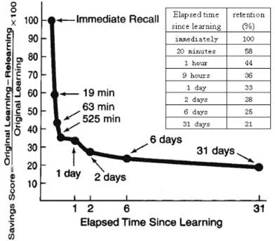 Как мы видим на графике после прошествия 20 минут в памяти остается 58% изначально запомненной информации. После одного часа 44% и так по нисходящей. Причем, 20-21% запомненной информации могут храниться крайне долго. У этой кривой существует продолжениие, которое характеризует ее изменение при повторном изучении информации.