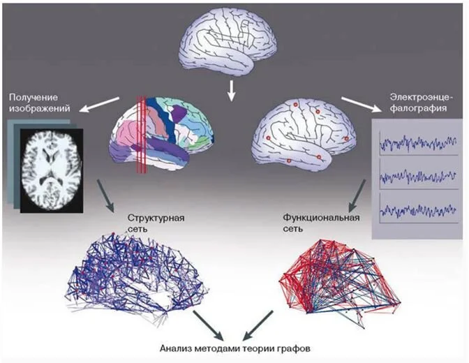 В 2005 году было введено такое понятие, как коннектом, под которым понималась совокупность всех связей в мозгу человека. Олаф Спорнс, Джулио Тонони вместе с Рольфом Кёттером из Фогтовского института исследований мозга в Дюссельдорфе опубликовали программную статью, которая называлась «Человеческий коннектом. Описание структуры мозга человека» («PLoS Computational Biology», 2005). На смену лозунгу «Я — это мой геном» пришел новый: «Я — это мой коннектом». Как известно получение опыта опосредует появления в нашем мозгу нейросетей, которые откликаются на повторение этого опыта. При этом наша реакция на похожую (уже встречавшуюся) ситуацию будет более адекватной. Так как наши знания, убеждения, навыки и умения представляют собой совокупность нейронных сетей, то наш мозг целиком состоит из таких графов, которые каким, то образом образуют один большой граф. Важно различать коннектом и когнитом. Когнитом — это сумма элементов индивидуального опыта. Таким образом, когнитом является подмножеством графа коннектома. При этом, в процессе восприятия нового опыта, эти связи изменяются или корректируются. Но так как наш мозг состоит из 100 миллиардов нейронов и между ними существует астрономическое число связей построение коннектома для всего человеческого мозга процесс, который не сможет быть подвержен обработке, ни одним известным на сегодня суперкомпьютером. А вот небольшой червячок с именем Caenorhabditis elegans, который имеет 302 нейрона и 6-7 контактов между ними, хороший плацдарм для зачинания такого моделирования. Ниже представлен его коннектом, где каждая точка представляет собой нейрон, а грань — связь. Для такого моделирования существует несколько методов. Одним из таких является трактография, или диффузионная тензорная визуализация (diffusion tensor image, DTI). Методом магнитно-резонансной томографии прослеживается диффузия воды в тканях и клеточных структурах, в данном случае — в отростках нейронов. Таким способом определяют ход пучков нервных волокон и восстанавливают картину связей между разными областями живого мозга. А сетевые карты можно изучать методами теории графов и динамических систем, это уже переход к теории. Хотя и здесь не все просто. В теории графов существуют свои загвоздки, которые трудно или практически не решаемы методами, которые используются в современных компьютерах. Что есть граф — это некоторая совокупность вершин соединенных связями. Количество связей, приходящих в один граф называется его степенью. Элементарные пути, цепи, циклы и контуры называют гамильтоновыми, простые — называются эйлеровыми. Граф G (X) называется однородным, если степень всех его вершин одинакова. Понятие «однородный граф степени r» означает, что каждая вершина данного графа имеет степень, равную r. В однородных графах степени r число ребер равно: m = (1 / 2) n · r. Примером однородных графов являются правильные многогранники: тетраэдр, куб, октаэдр. Но методами современных компьютеров плохо решается задача по поводу раскрашивания в различные цвета графа n вершин, так чтобы каждую из граней не попирали одинаковые цвета: