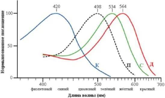 Каждый тип колбочек обладает собственной спектральной чувствительностью. Считается, что первый тип воспринимает световые волны с длиной от 400 до 500 нм (синий), второй — от 500 до 600 нм (зеленый) и третий — от 600 до 700 нм (красный). Цвет ощущается в зависимости от того, волны какой длины и интенсивности присутствуют в свете.
