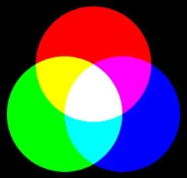 Для аддитивной цветовой модели RGB (англ. Red, Green, Blue — красный, зеленый, синий) выбор основных цветов обусловлен особенностями физиологии восприятия цвета сетчаткой человеческого глаза. Аддитивность данной системы заключается в том, что цвета в ней получаются путем добавления к черному цвету. Иначе говоря, если цвет экрана, освещенного цветным прожектором, обозначается , а цвет того же экрана, освещенного другим прожектором — , то при освещении двумя прожекторами цвет экрана будет обозначаться как .