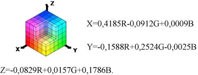Как уж было отмечено, к системе RGB близка другая, принятая с ней почти одновременно система — XYZ, основные цвета в которой являются воображаемыми, более насыщенными, чем спектральные. Именно потому, что цветов этих не существует, их обозначили символами неизвестных величин. Введение таких сверхнасыщенных цветов позволяет избавиться в колориметричеких системах от отрицательных цветовых координат, неизбежных в случае реальных цветов. Основные цвета записываются уравнениями